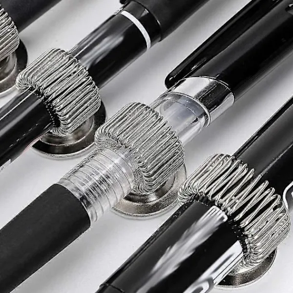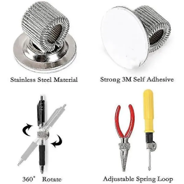 1, Justerbar Fjäderögla – Den innovativa designen i rostfritt stål gör att öglan kan expandera för att passa alla storlekar av pennor, blyertspennor och markörer, från mindre till större, 360 graders rotation.