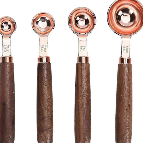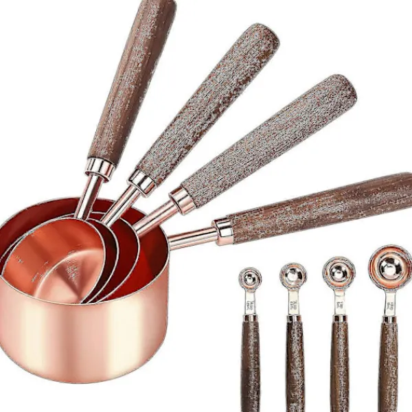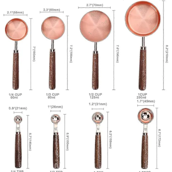 Tillverkad av rostfritt stål av livsmedelskvalitet, vilket är säkert, hälsosamt och har en lång livslängd. Ergonomiskt valnötshandtag för ett perfekt grepp, halkfritt, bekvämt att beröra. Den yttre spegelpoleringen och den inre satinpoleringen gör att de ser lyxiga ut. Set med 4 olika koppar och 4 skedar, inklusive 250 ml, 125 ml, 80 ml, 60 ml; 15 ml, 5 ml, 2,5 ml, 1,25 ml, uppfyller dina olika behov. Mångsidig, idealisk för att mäta mjöl, socker, havre eller flingor och bakverk.