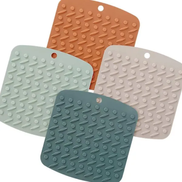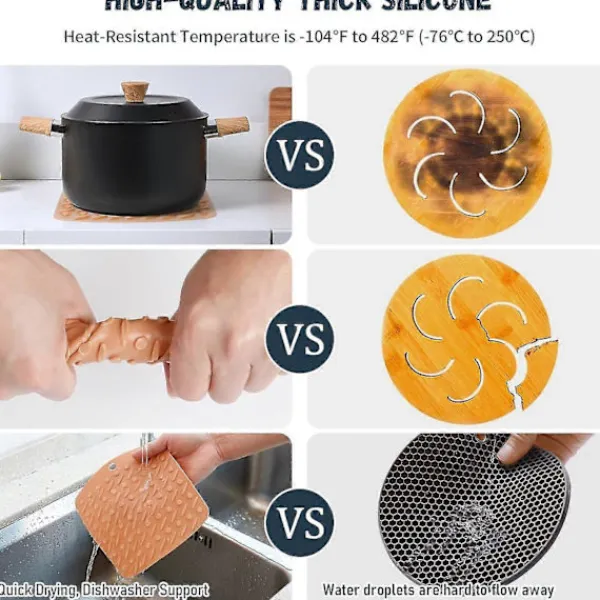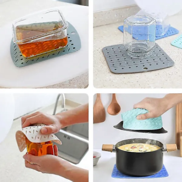 Lätt att rengöra silikon av livsmedelskvalitet – Underläggen är gjorda av 100 % silikon av livsmedelskvalitet. Det är läckagesäkert, BPA-fritt, missfärgas inte, ruttnar inte, absorberar inte dåliga lukter eller ändrar smaken på andra livsmedel. Det kan användas i ugn, kylskåp eller mikrovågsugn. Samtidigt är silikonet smutsavvisande och lätt att rengöra. Tvätta helt enkelt för hand eller i diskmaskinen. Bättre värmeisolering – Temperaturområde från -40C till 250C. Så det skyddar inte bara din bordsyta, utan det kan också användas som ett stativ för bestick, kastruller eller skedar; eller som en torkmatta. Lämplig för användning där ytterligare termiskt skydd krävs. Det speciella mönstret förhindrar vattenläckage, ger halkfria egenskaper och enkelt grepp. Genomtänkt design – Remmarna på de värmebeständiga silikonunderläggen ser inte bara snygga ut, utan de är också halkfria, vilket gör att du kan hålla en mängd olika kastruller, tallrikar, muggar eller koppar utan problem. Nybakade kakor. Det runda hålet på underlägget gör det enkelt att förvara och tar inte upp extra plats när det hänger på kroken. FLEXIBEL OCH HÅLLBAR – Innovativ design skapar en halkfri yta som skyddar bänkskivor från värme- eller vattenskador utan att absorbera lukter eller skapa mögel. Dessa isoleringskuddar kan också användas som dekoration i köket och matsalen. Paketinnehåll – Du får 4 fyrkantiga silikonunderlägg (rosa grå, stålblå, sjögrön, brun).