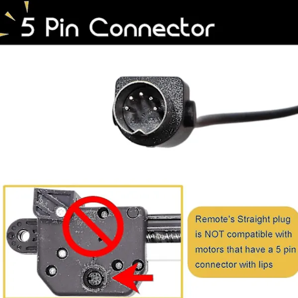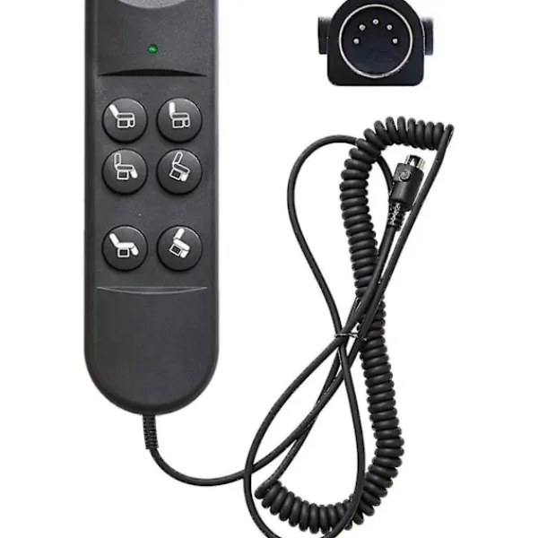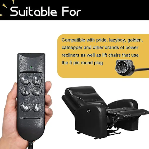 6 KNAPPAR: Fjärrkontroll med 5-stifts kontakt Handkontroll för Lyftstolar Elvilstolar. OBS: Vissa av knapparnas funktioner kan vara omvända beroende på din stoltillverkareKOMPATIBILITET: Kompatibel med Lazyboy, Golden, Catnapper 4847 Powerlift Chair, Okin, Dewert, Kaidi, Mulin, fbs och många märken av elvilstolar och lyftstolar som använder en rak 5-stifts rund kontakt.ANSLUTNING: Sladdlängd cirka 1,8 meter, ansluts till motorn med en rak kontakt, 180 graders vinkelkontakt i änden. Den kommer INTE att fungera med motorer som har en 5-stifts honkontakt med läpparFRÅGOR: Kontakta oss ALLTID INNAN, om du har några frågor.GARANTI: 1 år6-knappsfjärrkontroll 5-stifts kontakt Handkontroll för Lyftstolar Elvilstolar OBS: Vissa av knapparnas funktioner kan vara omvända beroende på din stoltillverkare