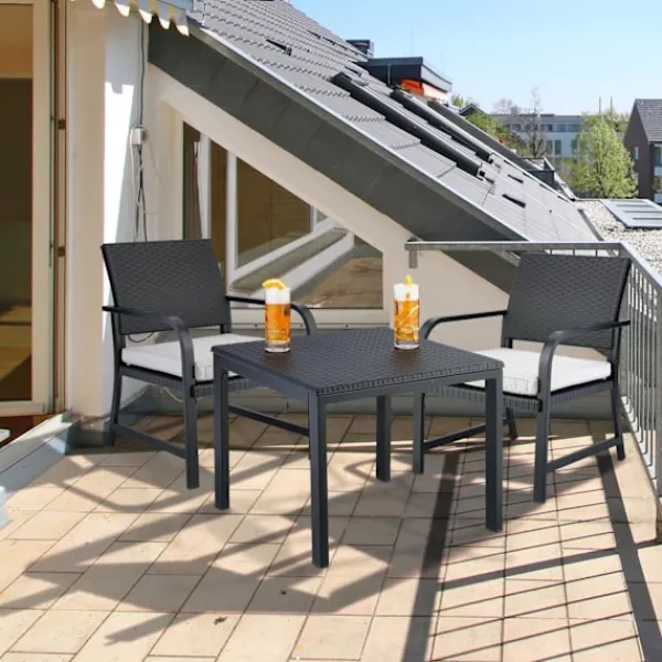 Ge din balkong en mysig atmosfär med det här moderna balkongmöblemanget. Setet innehåller ett bord och två stolar, perfekt för avkoppling utomhus. Det robusta trädgårdssetet är väderbeständigt och den praktiska ytan i rottinglook är särskilt lätt att rengöra. De stoppade dynorna garanterar maximal sittkomfort. Njut av de varma dagarna med dessa utemöbler och koppla av i ditt eget lilla utomhusparadis.