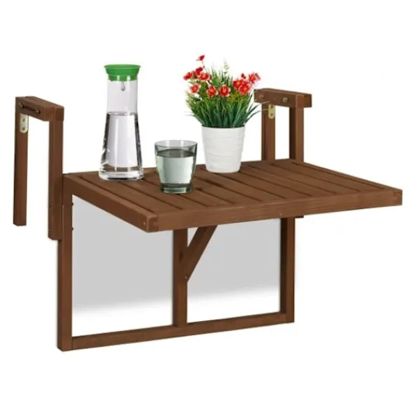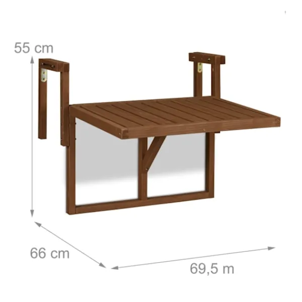 Knapriga frallor på morgonen eller ett glas vin och smarriga tilltugg på kvällen – mat och dryck smakar helt enkelt bättre utomhus. Detta praktiska balkongbord i mörkbrunt trä hängs upp på balkongräcket och ger plats för fikat och tidningen – eller varför inte en fin krukväxt och en lykta för ännu mer mys? När du har fått nog av frisk luft och solsken är det bara att fälla ner bordet för att spara plats på din lilla balkong. Utebordet kan justeras i höjden för att passa olika tjocka räcken.