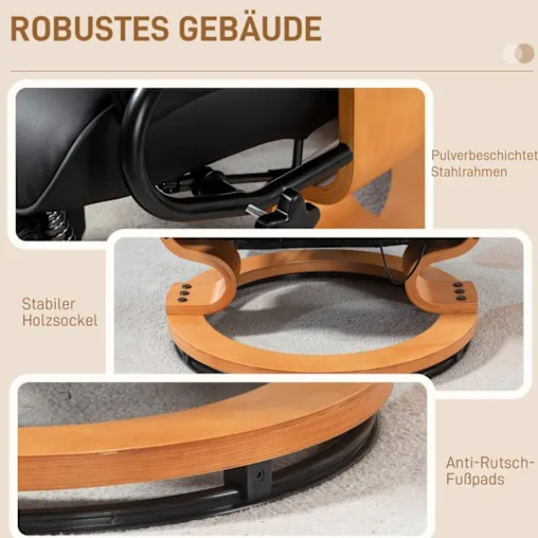 Denna vilstol är inte bara en möbel utan en inkörsport till avkoppling. Dess höga ryggstöd och utsvängda armstöd är generöst vadderade, vilket säkerställer att du kan sjunka ner i komfort efter en lång dag. Klädseln i konstläder är inte bara lyxig utan också praktisk, eftersom den är lätt att rengöra och underhålla. Den robusta konstruktionen, med pulverlackerat stål och flerskiktigt trä, garanterar hållbarhet och livslängd. Dessutom säkerställer de halkfria fötterna stabilitet och skyddar dina golv från repor.