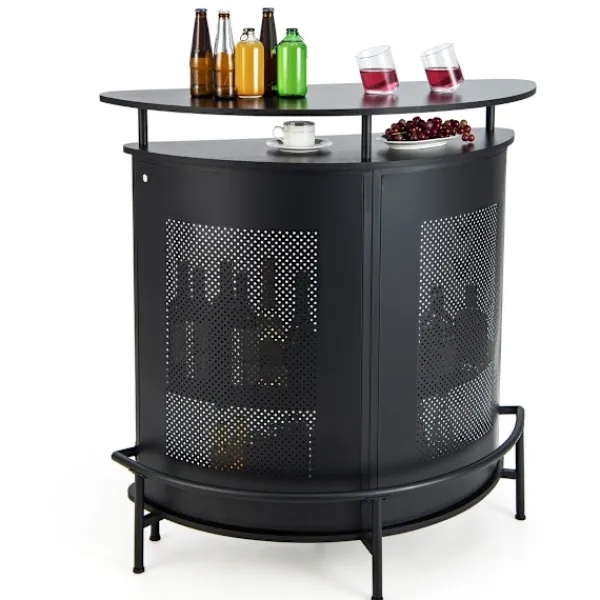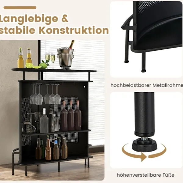 Designad med en höjd på 112,5 cm, den här hemmabarenheten underlättar tillfälliga samtal mellan dig och dina gäster. Den släta ytan är lätt att rengöra med en mjuk trasa, vilket sparar tid och ansträngning. Den robusta metallramen säkerställer hållbarhet och stabilitet, med varje hylla kan bära en mängd olika föremål. De sex justerbara fötterna garanterar att stången förblir stabil även på ojämna ytor, vilket förhindrar repor på dina golv.