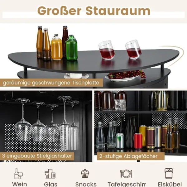 Designen i fyra nivåer erbjuder en rymlig, böjd bordsskiva, en öppen hylla och två extra förvaringsnivåer, vilket ger gott om plats för cocktailshakers, vinflaskor eller ishinkar. Dessutom kan de tre inbyggda glashållarna rymma cirka 9-12 glas, vilket säkerställer att dina glasvaror alltid är inom räckhåll. Den perforerade metallfronten lägger till ett extra lager av skydd och förhindrar vinflaskor från att falla, medan det bekväma fotstödet i metall låter gästerna koppla av och njuta av sin tid.
