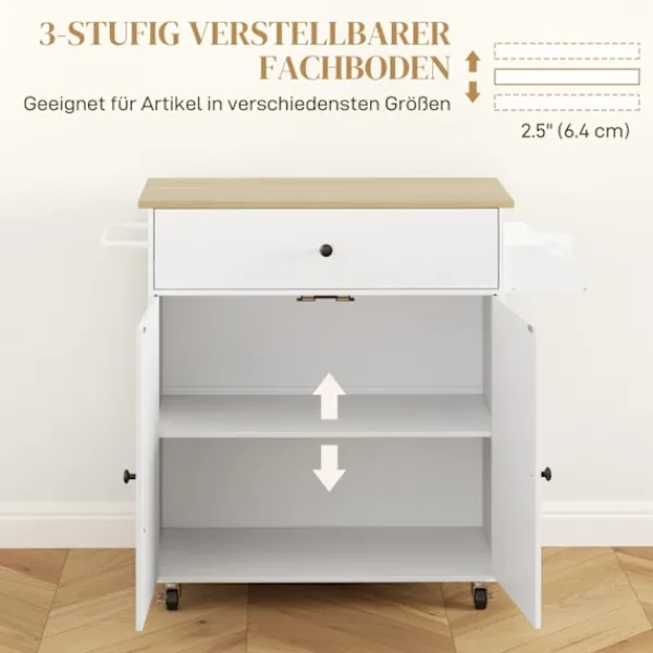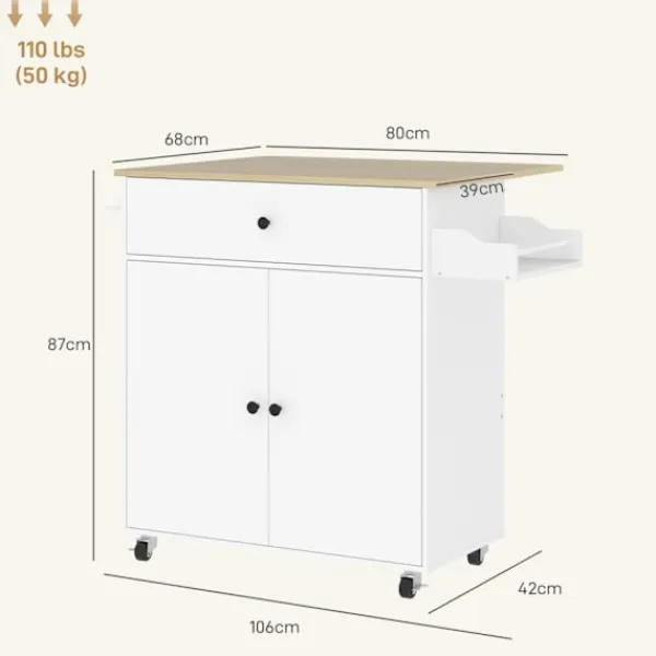 Mobilitet är en nyckelfunktion i denna köksvagn, tack vare dess fyra hjul, varav två är utrustade med bromsar för ökad stabilitet. Detta gör det enkelt att flytta runt vagnen i ditt kök eller matplats efter behov. Lådan fungerar smidigt på glidskenor och de magnetiska dörrgångjärnen ser till att skåpdörrarna stängs säkert. Den melaminbelagda ytan ger inte bara en touch av elegans utan gör också rengöringen till en lek och behåller vagnens orörda utseende.