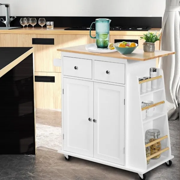 Förvandla dina köksuppgifter till en härlig upplevelse med vår eleganta köksvagn. Denna mångsidiga köksö på hjul är designad för att erbjuda gott om förvaring och organisation för dina nödvändiga kökssaker. Tillverkad med en bred bänkskiva i massivt trä, ett tvådörrarsskåp, två lådor, en handdukshållare och ett trevånings kryddställ, säkerställer denna köksvagn att din matlagningsplats förblir rörig och effektiv.