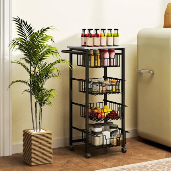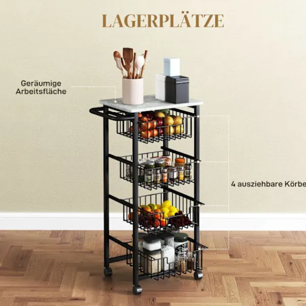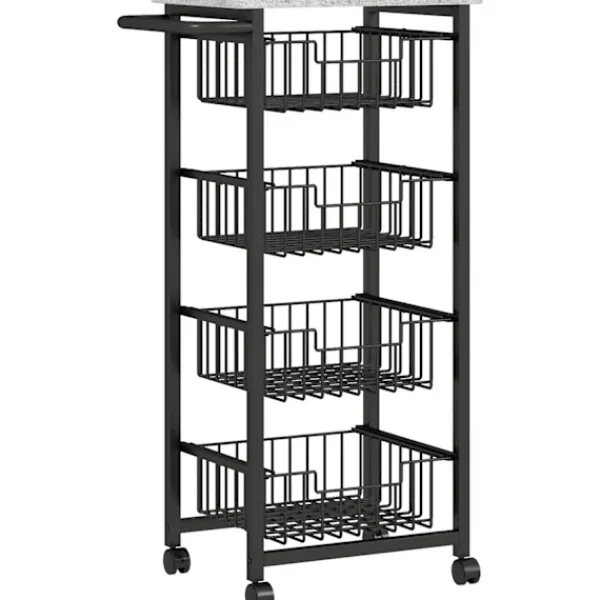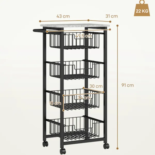 Förbättra ditt kök med en mångsidig rullande köksvagn med en rymlig bänkskiva och fyra utdragbara korgar för effektiv matlagning och organisering.