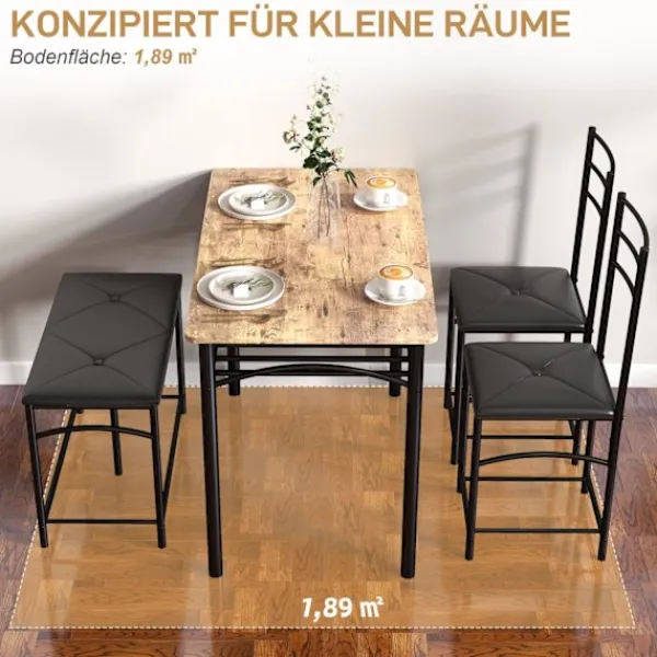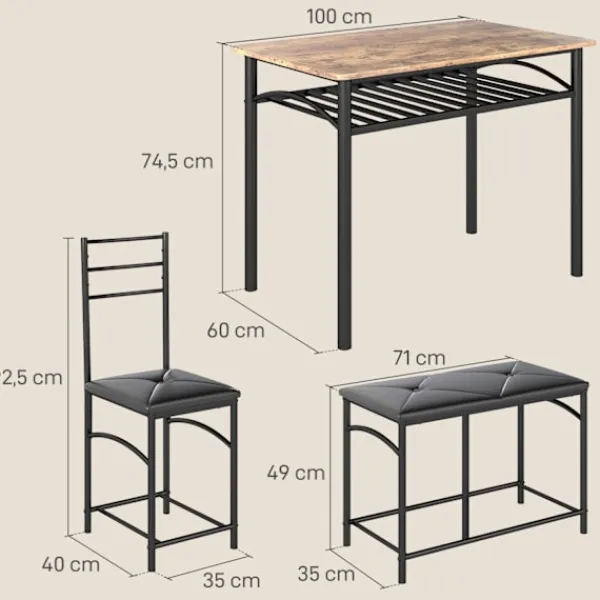 Vi introducerar det eleganta och utrymmeseffektiva matbordssetet, ett perfekt komplement till alla hem som vill maximera utrymmet utan att kompromissa med stilen. Detta intelligent designade set innehåller ett bord, två stolar och en bänk, som alla passar sömlöst ihop för att uppta bara 1,89 kvadratmeter. Sätena är genomtänkt vadderade med skum och klädda i premium konstläder, vilket erbjuder både komfort och sofistikering. Den rustika, industriella designen hos detta matsalsset kompletterar utan ansträngning alla inredningsdetaljer, vilket gör det till ett idealiskt val för små utrymmen.