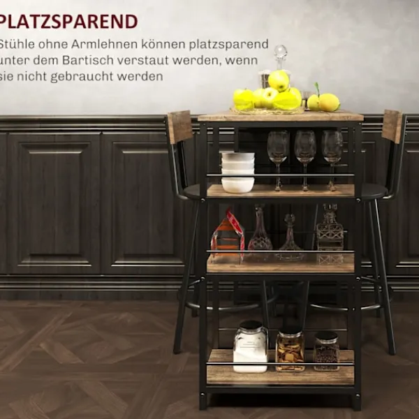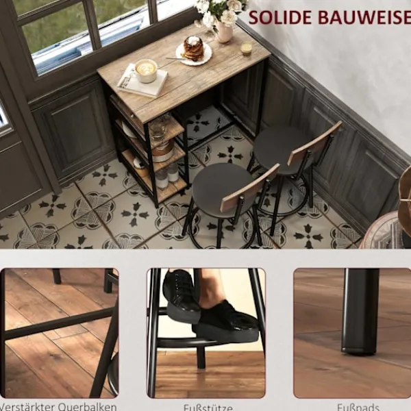 Förvandla ditt kök till ett mysigt och funktionellt utrymme med vårt eleganta 3-delade matsalsset. Detta set innehåller ett mångsidigt barbord med integrerade hyllor och två bekväma barstolar, vilket gör det perfekt för små, intima utrymmen. Barbordet erbjuder gott om förvaring med sina tre sidohyllor, vilket ger en praktisk lösning för att hålla ordning på dina kökssaker. Den rymliga bordsskivan är idealisk för att njuta av frukost, en lätt lunch eller en drink med en gäst.