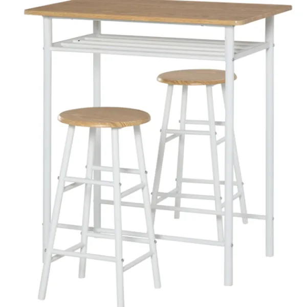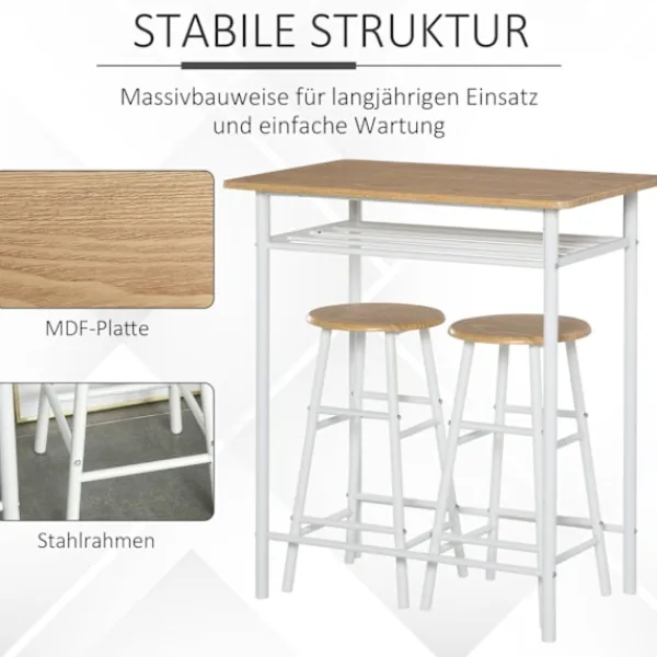 Detta 3-delade barbord och stolset från kommer med ett högt bord och två barstolar. Bistrobordet med 2 stolar är särskilt lämpligt för små kök. Ett förvaringsfack under bordsskivan fungerar som en hylla för vardagliga föremål som tidningar, frukt och kökstillbehör. Detta matsalsset är tillverkat av metall och MDF-trä. Konstruktionen är solid och stabil. Detta barbordsstolset från imponerar med sin praktiska design och sin unika industriella stil.