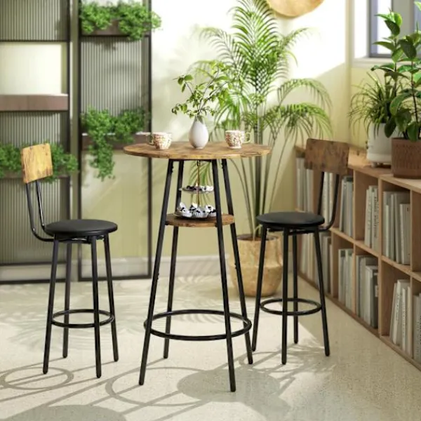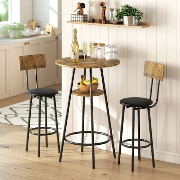 - Förbättra din matplats med ett barbordsset i tre delar som erbjuder rustik charm.