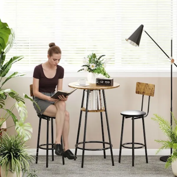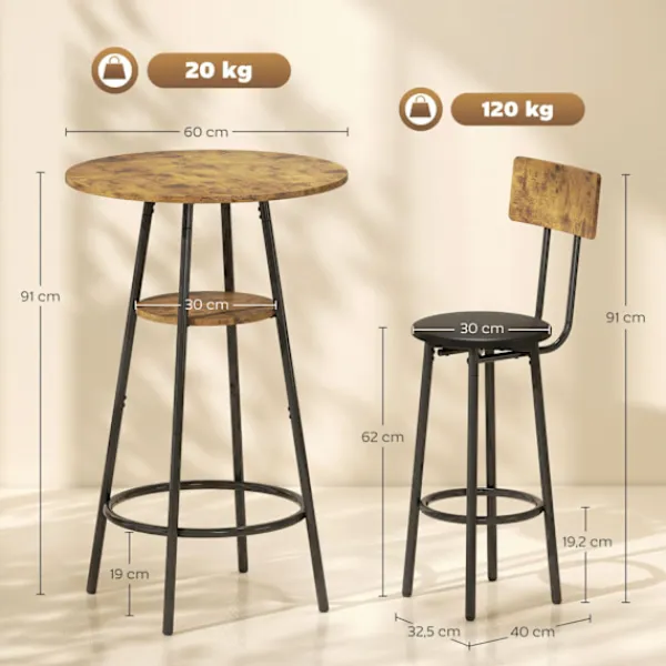 Förvandla vilket litet utrymme som helst till en välkomnande vrå med detta kompakta barbordsset, med rustik träfinish och robust svart metallram för industriell charm. Köksbänken i två nivåer håller dina nödvändigheter organiserade och lättillgängliga, medan två vadderade pallar med stödjande ryggstöd säkerställer varaktig komfort för frukost eller drinkar.
