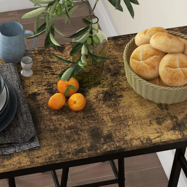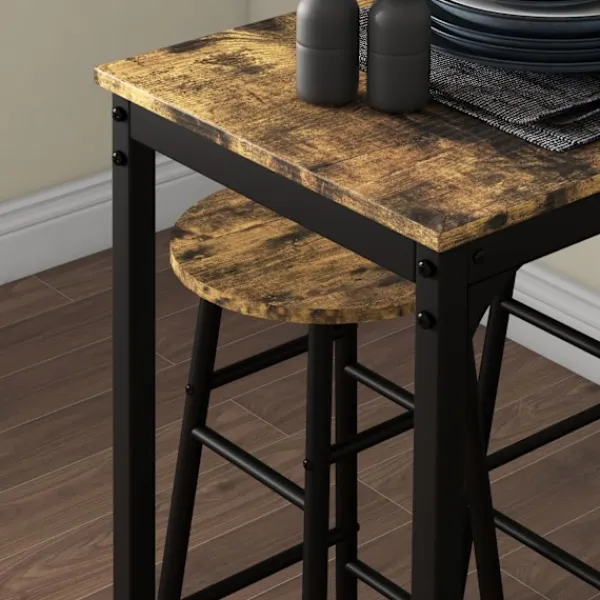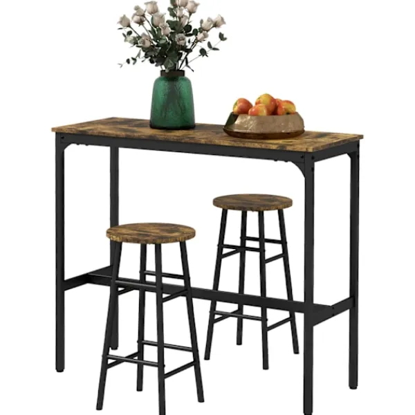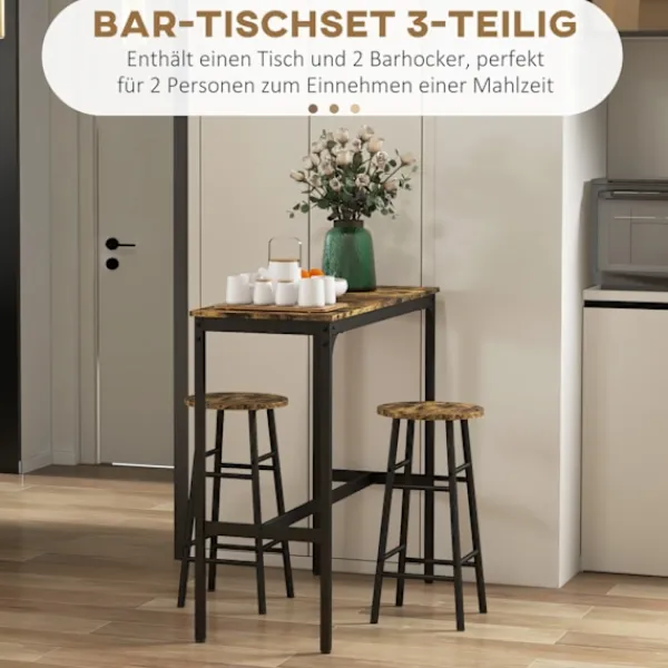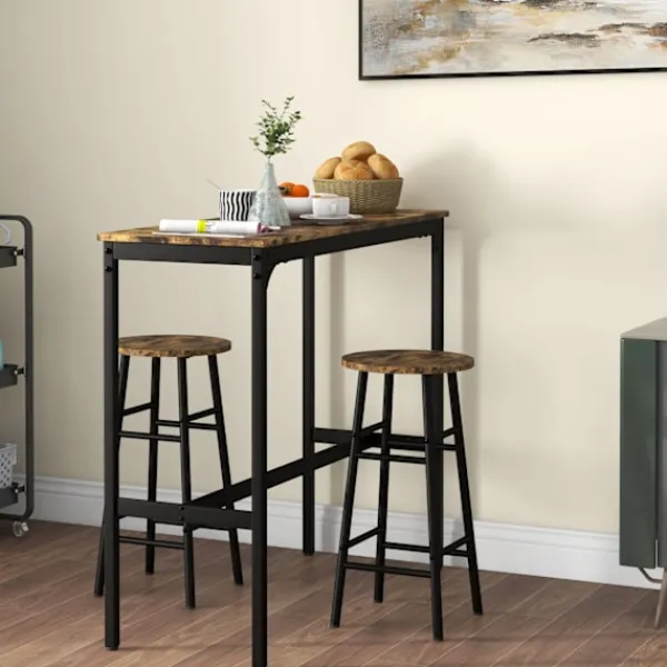 Förvandla ett litet utrymme till en inbjudande matplats. Med barbordet dukat för 2 personer kan du skapa en mysig plats för att njuta av måltider tillsammans med din partner. Barbordet med barstolsset har en solid svart stålram i kombination med snygga träpaneler och ger din matsal eller bardekoration en rustik-industriell touch.