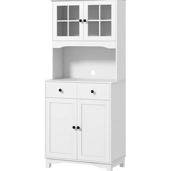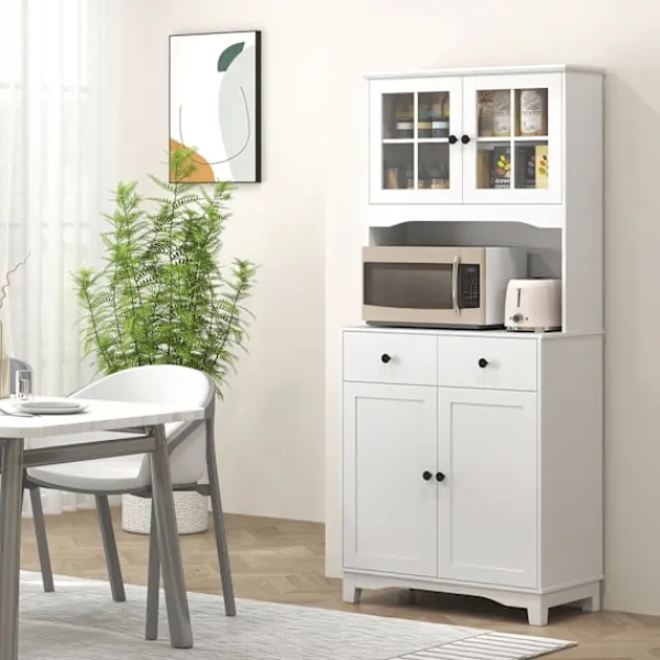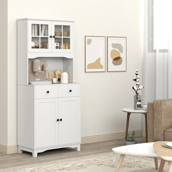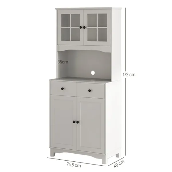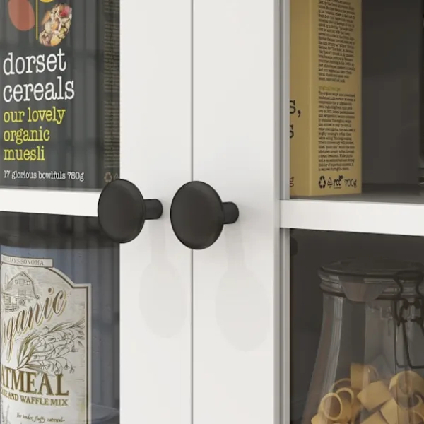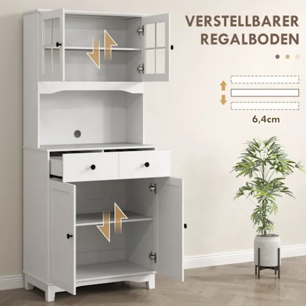 Med vitrinskåpet kan du skapa tydlig ordning. Detta rymliga hallskåp har två skåp med dubbla dörrar och två lådor, vilket gör det enkelt att organisera dina nödvändiga kökssaker. Det finns plats för mikrovågsugn eller kaffemaskin på den stora bänkskivan och det finns även en användbar öppning för elkablar. Höjden på hyllorna kan också justeras individuellt!