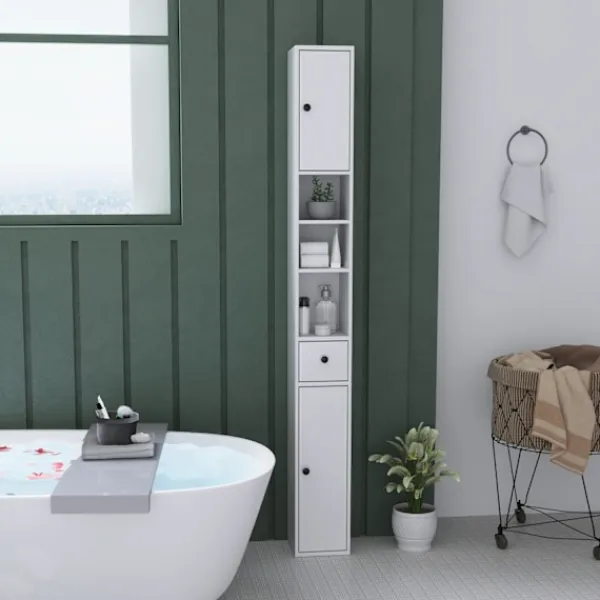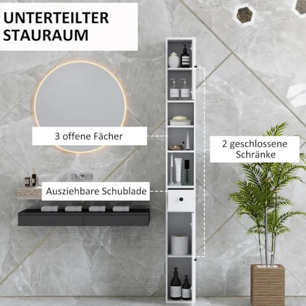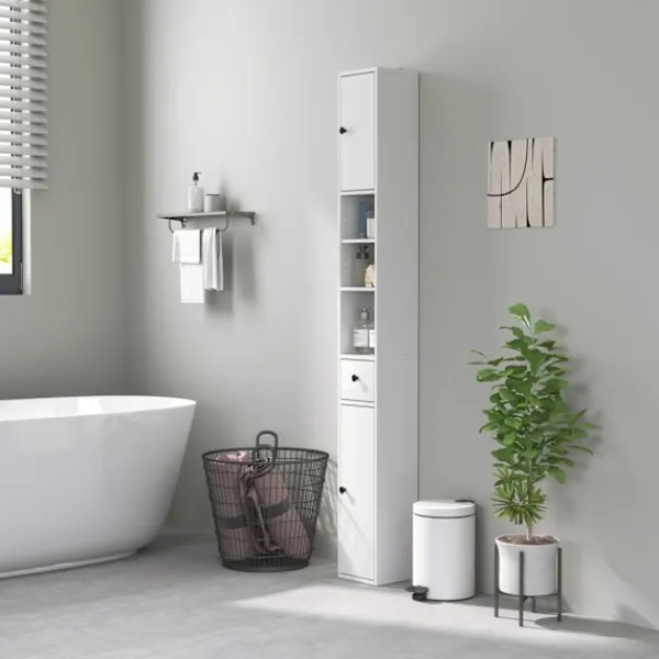 Förvandla ditt badrum till en organiserad oas med vårt höga badrumsskåp, expertdesignat för trånga utrymmen. Detta kompakta men rymliga skåp erbjuder en perfekt blandning av stil och funktionalitet, vilket gör det till ett idealiskt val för moderna badrum. Med sin eleganta design och mångsidiga förvaringsmöjligheter säkerställer den att varje föremål har sin plats, vilket håller ditt badrum snyggt och stökigt.