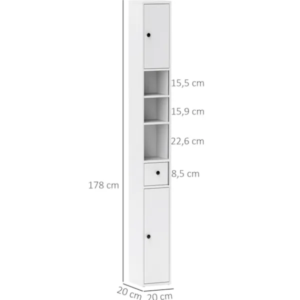 Det här vita badrumsskåpet är tillverkat av hållbara material som spånskivor och MDF och är byggt för att hålla. Dess melaminbelagda och målade ytor ger inte bara en touch av elegans utan gör också rengöringen till en lek. Skåpet har två stängda fack, en låda och tre öppna sektioner, vilket ger gott om förvaring för alla dina badrumsartiklar. De justerbara hyllorna låter dig skräddarsy förvaringsutrymmet efter dina specifika behov, oavsett om det är för handdukar, toalettartiklar eller städmaterial.