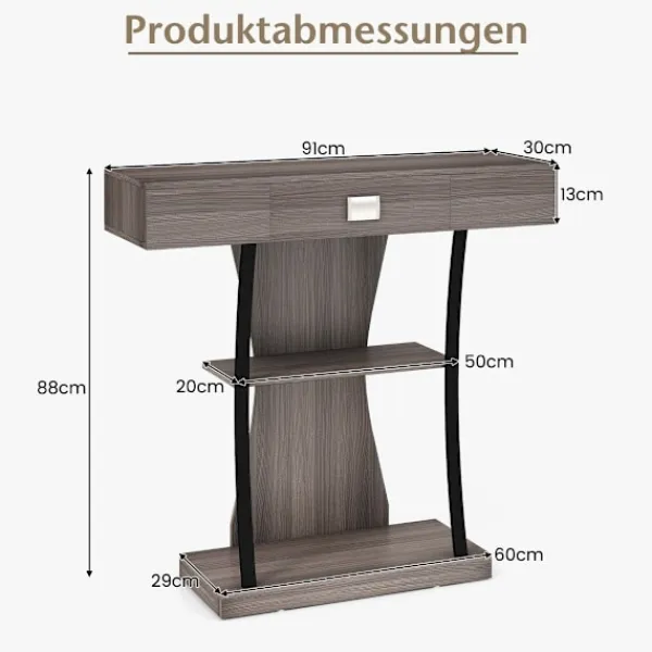 Förvandla ditt hem med vårt eleganta svarta trevåningskonsolbord, designat för att ge charm och funktionalitet till alla rum. Denna mångsidiga del ger inte bara gott om förvaring utan fungerar också som en fantastisk display för din favoritinredning. Den unika förskjutna designen på de stora och små hyllorna, kompletterade med mjukt böjda metallstödrör, skapar en harmonisk balans mellan de övre och nedre sektionerna, vilket bryter monotonin hos stela linjer. De klara träfibrerna på ytan framhäver strukturen, vilket gör den till en framstående del i alla hallar eller entréer. Dess breda bas säkerställer stabilitet och den kan säkras med en tippskyddsmekanism för ökad säkerhet.