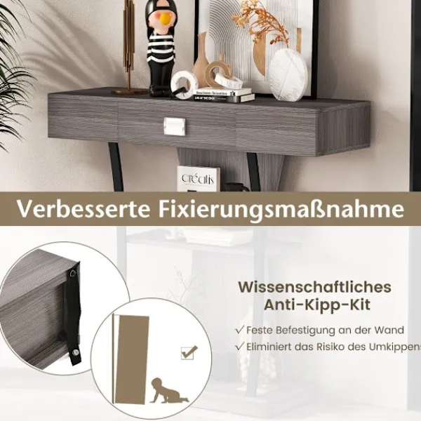 Konsolbordets tunga bordsskiva och bas förskjuts vackert av de lätt böjda metallrören, som ger en touch av elegans och avslöjar träets struktur. Denna konstnärliga skapelse kommer säkerligen att fängsla vid första anblicken. Bordets pålitliga stabilitet säkerställs av dess breda bas som stöds av robusta metallrör, och de halkfria fotkuddarna skyddar dina golv från repor. För barnfamiljer hjälper tippskyddsmekanismen till att fästa konsolbordet på väggen, vilket garanterar säkerhet för alla.