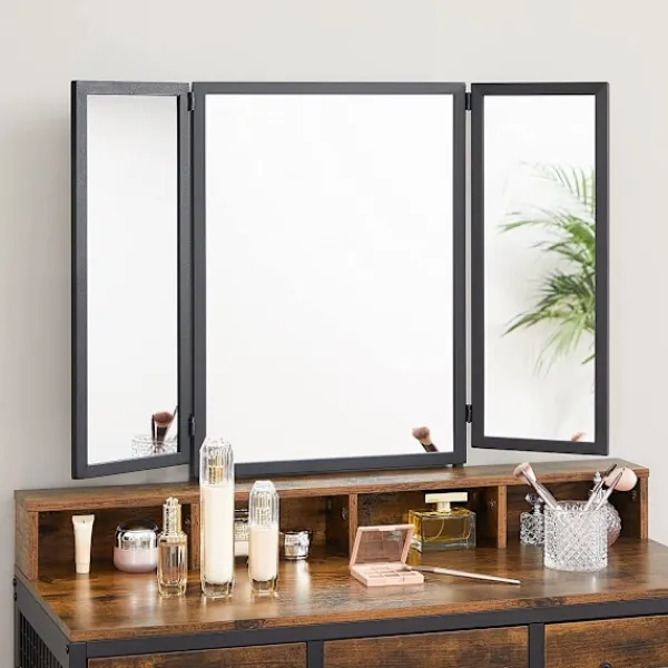 Sminkabordet är tillverkat i rustik stil, d.v.s. se gammal ut . Sminkbordet är stabilt, och den breda skivan och 3 rymliga lådor låter dig lagra smink, kosmetika för ansiktsvård och ett hybridmanikyrset. Spegeln är stängd, så det finns ingen rädsla för att den samlar damm . Dessutom har sidospegeldörrarna krokar för halsband. 4 fack under förlängningen ser till att det du behöver mest alltid finns till hands.