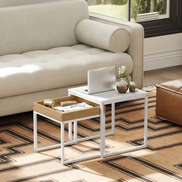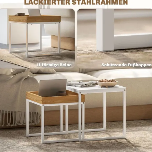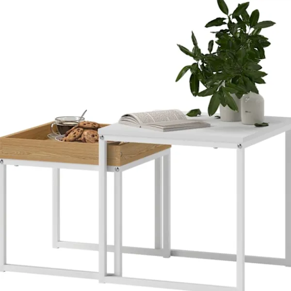 Med det snygga soffbordssetet från dig kan du inte bara förbättra ditt hem visuellt. Detta soffbordsset innehåller ett stort och ett litet bord, som kan användas individuellt eller kombineras på en mängd olika sätt. Soffbordets moderna design möter eleganta vita ytor och subtila ekfibrer, som stöds av robusta, U-formade ben. Perfekt för rum där du vill lägga till en touch av modern elegans.