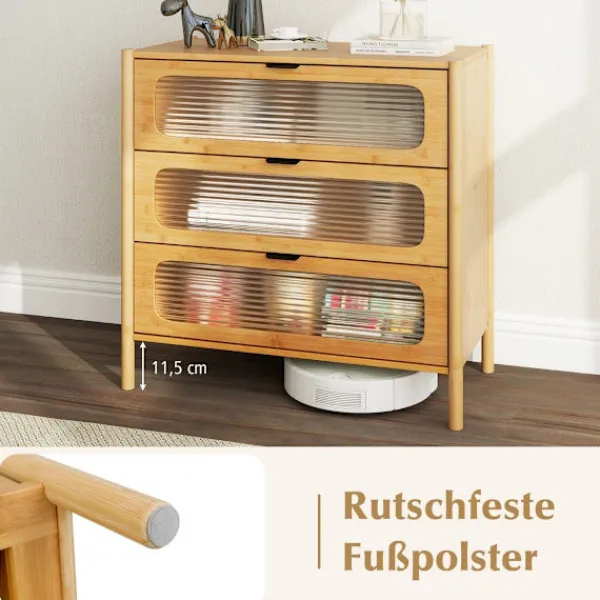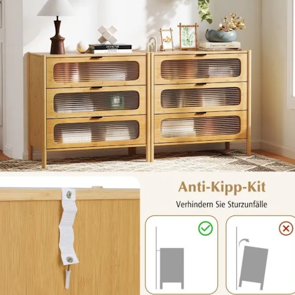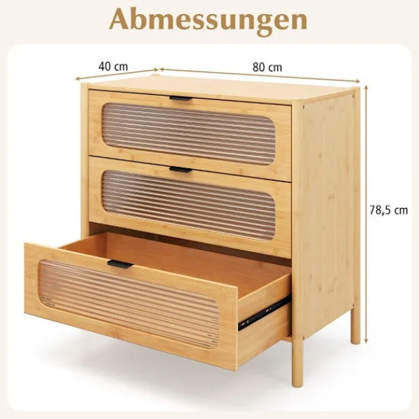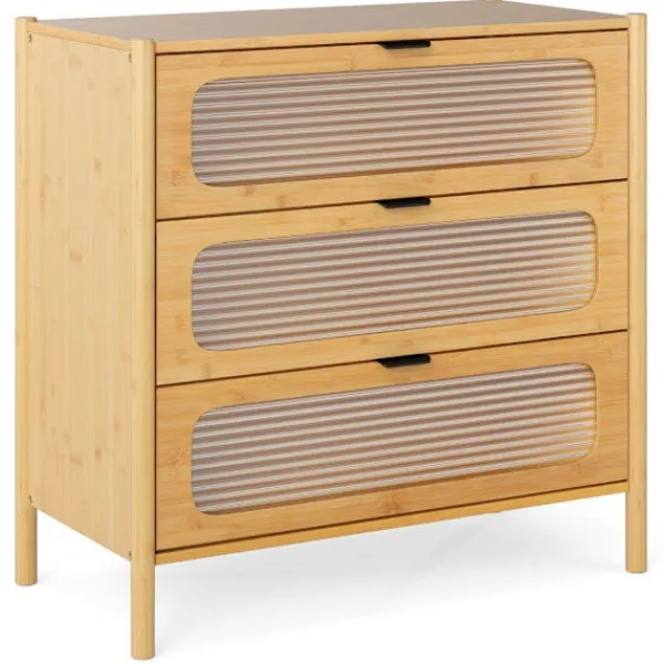Upptäck elegans och funktionalitet med vår bambubyrå med 3 lådor, designad för att förbättra ditt utrymme samtidigt som den bär upp till 110 kg. Dess räfflade glasfronter och eleganta handtag ger en touch av sofistikering.