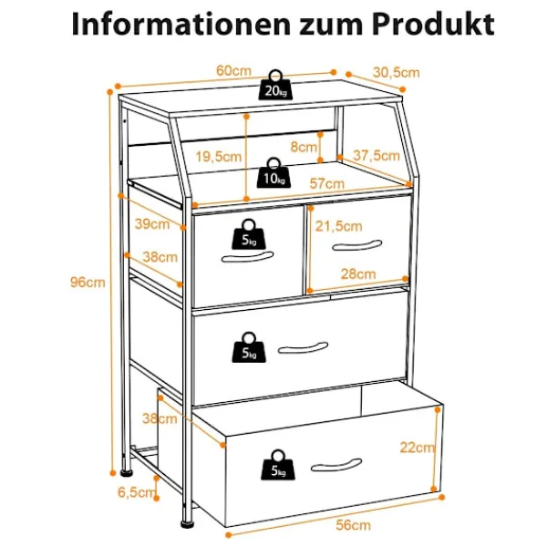 Tygbyrån med 4 lådor erbjuder gott om förvaring för att rensa ditt utrymme effektivt. Dess hyllplan med två nivåer ger visningsmöjligheter, medan lådorna håller föremål dolda. Utrustad med tippskydd för säkerhet.