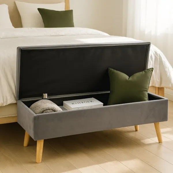 Upptäck den moderna förvaringsbänken, en mångsidig sittlösning med gott om förvaringsutrymme, perfekt för alla rum. Denna stoppade bänk kombinerar komfort och funktionalitet med ett mjukt sammetsöverdrag och en nedfällbar sits.