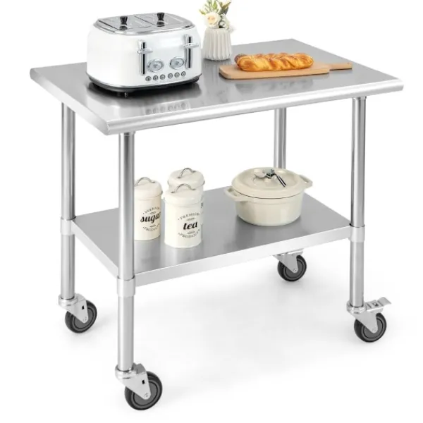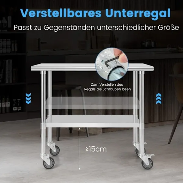 Vår arbetsbänk i rostfritt stål är designad för att stödja dig med olika förvarings- och mathanteringsuppgifter med exceptionell komfort och effektivitet. Denna robusta arbetsbänk är utrustad med fyra 360°-hjul, varav två är låsbara, så att du enkelt kan flytta den från ett rum till ett annat. Den justerbara hyllan ger flexibiliteten att lagra en mängd olika föremål, vilket gör den till ett oumbärligt komplement till alla arbetsplatser. Med en lastkapacitet på 150 kg på bordsskivan och 100 kg på den nedre hyllan kan denna arbetsbänk rymma ett stort antal föremål. Oavsett om det används som matbord på en restaurang eller som förvaringshylla i ett verktygsrum, är dess mångsidighet oöverträffad. Installationsprocessen är enkel och monteringen kan slutföras snabbt genom att följa instruktionerna. Du kommer inte ångra att du valde vår slitstarka arbetsbänk i rostfritt stål.