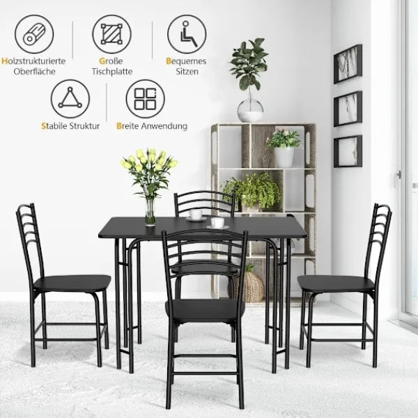 Kämpar du med begränsat matutrymme? Vårt matset i 5 delar är den perfekta lösningen för att förvandla varje måltid till en härlig upplevelse. Det här setet innehåller ett rymligt bord och fyra bekväma stolar, designade för att passa sömlöst in i vilken matplats, frukostvrå eller kök som helst. Tillverkad av slitstark MDF-skiva och en pulverlackerad metallram, utlovar detta matset många år av pålitlig användning. Den unika designen med runda hörn, bordsben med dubbla stång och tvärram under sätet förbättrar stabiliteten och användarupplevelsen.