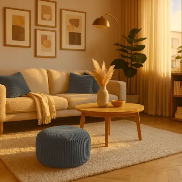 Den runda golvkudden, tillverkad av mjuk manchester, erbjuder mångsidig komfort och stil. Perfekt för extra sittplatser eller som fotstöd, denna puff förhöjer vilket vardagsrum som helst med sin bohemiska charm.