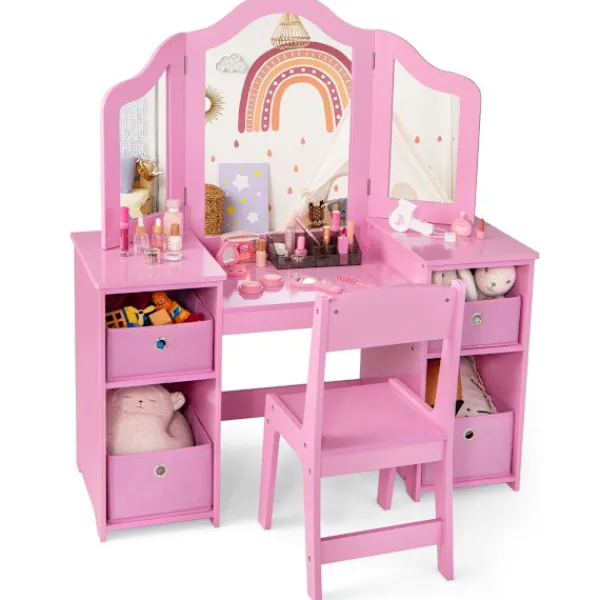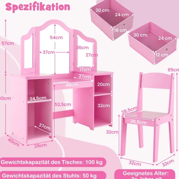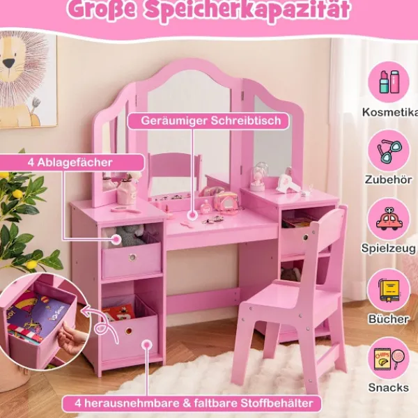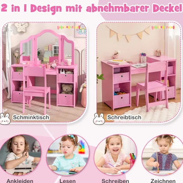 2-i-1 sminkduksset för barn förvandlas utan ansträngning från ett smycke till ett skrivbord, och erbjuder mångsidig användning för att klä sig, läsa, skriva och rita. Setet innehåller en stödjande stol för ryggradens komfort.