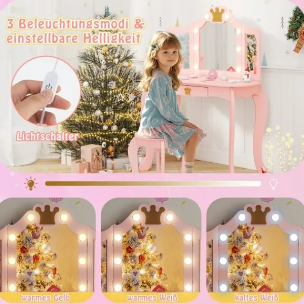 Avtagbar trippelspegel: Barnens fåfänga inkluderar en trippelspegel som ger en högupplöst reflektion från alla vinklar. Spegeln kan också tas bort, vilket gör att ditt barn kan använda bordet som ett smycke eller skrivbord.