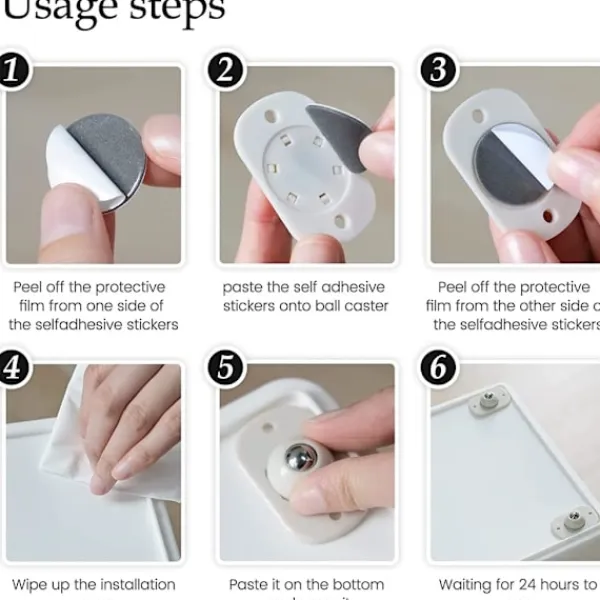 【Lätt att installera】Stark självhäftande design, enkel att installera, inga borrningar eller verktyg krävs. Fäst helt enkelt hjulen på undersidan av lådan, placera rullarna i botten av lådan och låt den gå i 24 timmar. Mjuka hjul är perfekta för att flytta och rengöra, och tunga föremål är inte längre ett problem!