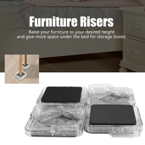 1. Möbelhöjaren är tillverkad av högkvalitativ plast, som är hållbar och har stor lastkapacitet 2. Höj dina möbler till önskad höjd och ge mer utrymme under sängen för förvaringslådor 3. Höjaren kan staplas så att du kan använda 1-2 höjare tillsammans för ett ben för att höja dina möbler 4. Passar till de flesta ben på säng, stol, datorbord, skrivbord, soffa och mer 5. Med halkfri botten, flerspårig design kan fixera möbelbenet stadigt utan att röra sig
