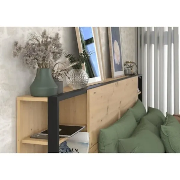 WHITE INDUS sänggavel med integrerade hyllor och sängbord – Struktur i spånskiva och MDF täckt med ekdekor och svarta dekorlister – Lämplig för 140×190 eller 140×200 eller 160×200 säng – Mått: L255 x H103 x D36 cm – Made in France
