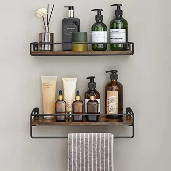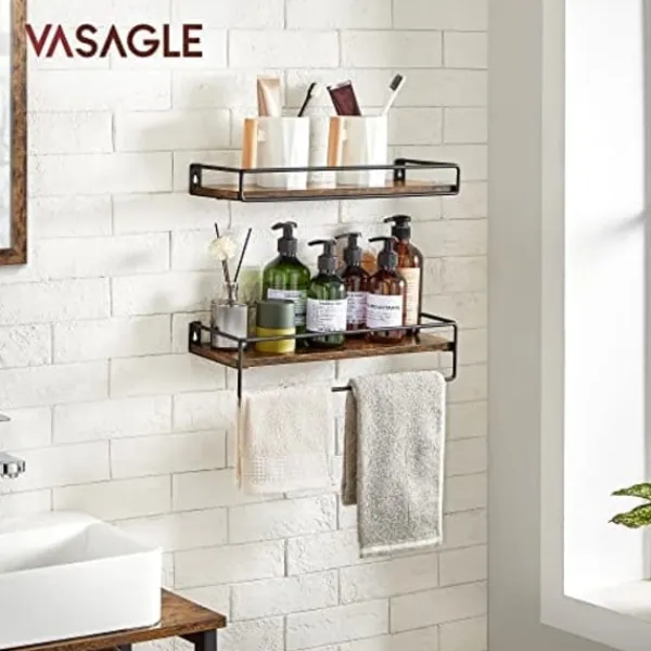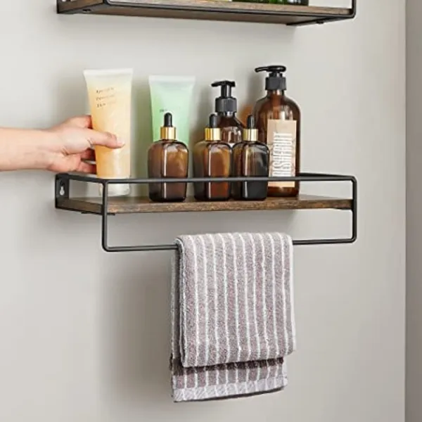 Specifikationer: Färg: Rustik Brun, SvartMaterial: Spånskiva, Stål. Storlek på den lilla hyllan: 15,7″ L x 6,1″ B x 2″ H (40 x 15,5 x 5 cm) Storlek på den stora hyllan: 15, 7″ L x 6,1″ B x 3,7″ H (40 x 15,5 x 9,5 cm) Total produktvikt: 4,4 lb (2 kg) Max. Hylla statisk lastkapacitet: 11 lb (5 kg) max. Statisk lastkapacitet för den hängande balken: 22 lb (10 kg) Förpackningens innehåll: 2 x Flytande hylla 1 x Monteringssats 1 X Instruktioner