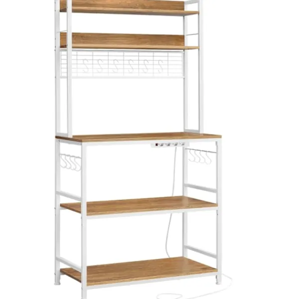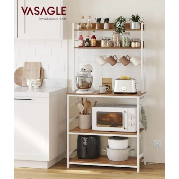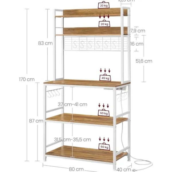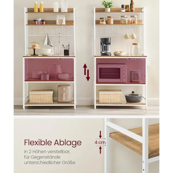 Justerbar hylla: den mittersta hyllan (max. lastkapacitet 130 lbs) detta köksställ kan justeras upp eller ner med 1,6 tum, så att du kan ta emot olika storlekar på redskap, från liten brödrost till mixer till mikrovågsugn