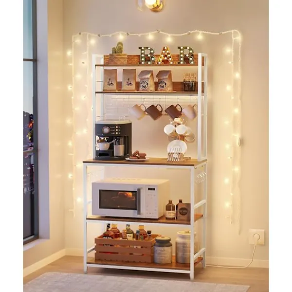 [Rymlig] Detta allt-i-ett-ställ med 5 hyllor för din mikrovågsugn, kaffebryggare, fritös och andra apparater, 14 S-formade krokar för att hänga upp koppar eller skedar på gallerplattan eller på sidostängerna skapar ordning i ditt kök! [STURDY, STURDY, STYLISH] Den förstklassiga rustika spånskivan och den robusta vita stålramen ger ett elegant, robust mikrovågsställ som uppgraderar ditt utrymme och stöder upp till 600 pund