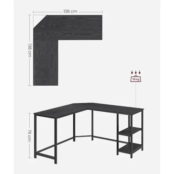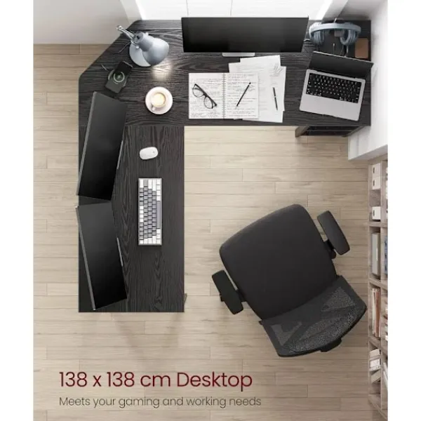 Detta datorbord har en imponerande arbetsyta på 138 x 138 cm, perfekt för att rymma upp till fyra skärmar och alla dina viktiga tillbehör. Den L-formade designen gör det enkelt att organisera dina enheter och skapa en effektiv arbetsmiljö.