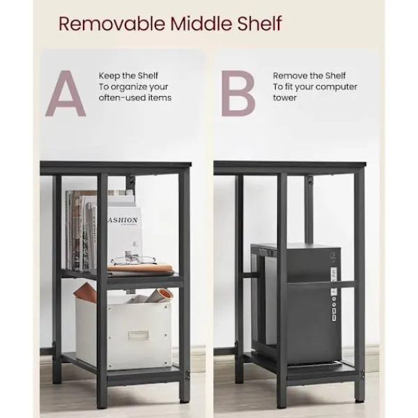 De öppna hyllorna inkluderar en avtagbar överdel som passar både ett datortorn och andra tillhörigheter, som böcker eller filer.