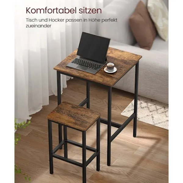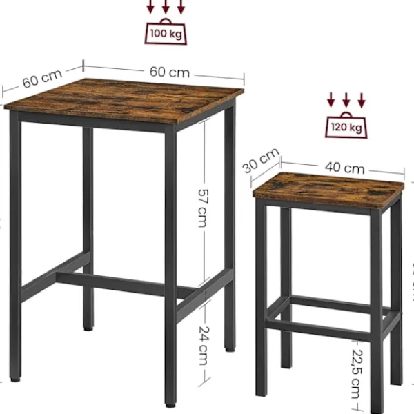 Produktdetaljer: Färg: Vintage brun/svart. Material: Wood Chipboard, stål. Tabellstorlek: 60 x 60 x 90 cm (d x w x h). Storlek per avföring: 30 x 40 x 65 cm (d x w x h). Total vikt: 19,1 kg. Max. Tabellens statiska belastningskapacitet: 100 kg. Max. Statisk lastkapacitet per avföring: 120 kgbox Innehåll: 1 x barbord, 2 x barstol, 1 x Tillbehörspaket, 1 x Instruktioner (engelska är inte garanterat)