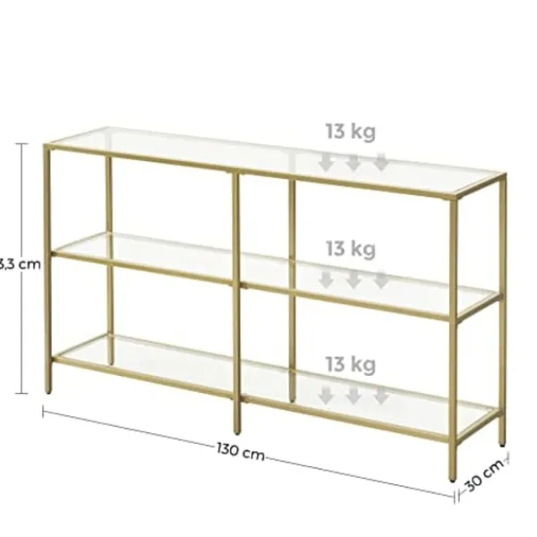 Specifikationer:- Färg: guldmaterial: stål, härdat glasproduktstorlek: 130 x 30 x 73,3 cm (l x w x h)- Produktvikt: 20,1 kg-max. Statisk lastkapacitet: 40 kg Package Innehåll:- 1 x Konsol Tabell- 1 x Monteringsväska- 1 x Anti-tippning Kit- 1 x Instruktioner