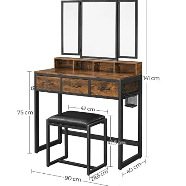 Vad du får: Ett imponerande toalettbord med en 3-delad fällbar spegel, en vadderad pall för extra komfort, en tydlig instruktioner för enkel montering och möjligheten att göra ditt skönhetsområde effektivt