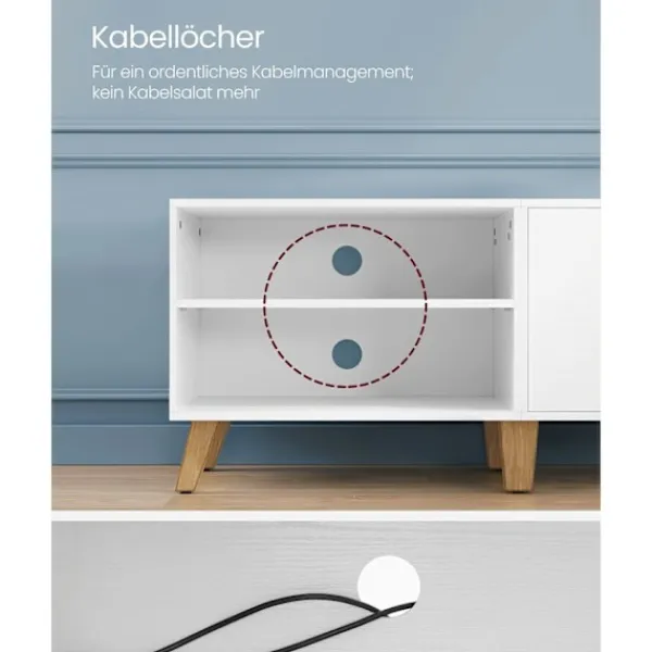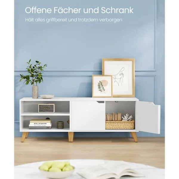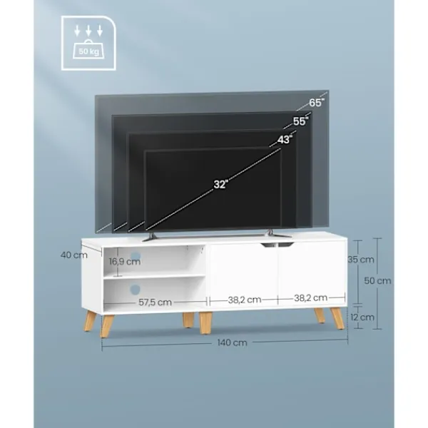 [Som på TV] Detta eleganta vita TV-skåp kommer att tillföra en ny charm till ditt vardagsrum. Med den kommer du inte längre att avundas de som får sitt hus omgjort i TV-program[Large Enough, It Is] Den här gången finns det inget sätt att benen på din TV kommer att sticka ut ur skåpet. Detta stativ rymmer TV-apparater upp till 65 tum. Liten tv? Utnyttja denna möjlighet att ordna plantorna på sidorna[Allt är klart] Kommer din favoritfilm att visas på TV? Njut av det på ett annat sätt än i en djungel av kablar och TV-tillbehör! Placera dina konsoler och lådor på de två öppna hyllorna och förvara dina DVD-skivor bakom dörrarna. Låt showen börja![The Oscar for Simplicity] Numrerade delar och detaljerade, lättförståeliga instruktioner följer med dig så att monteringen av detta TV-stöd inte förvandlas till en skräckfilm[3, 2, 1, Action!] Denna vita TV-möbel kommer att bli din allierade på söndagskvällen. Välj ett paket chips gömt bakom dess magnetiska dörrar och njut av din filmkväll med din familj eller vänner