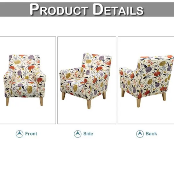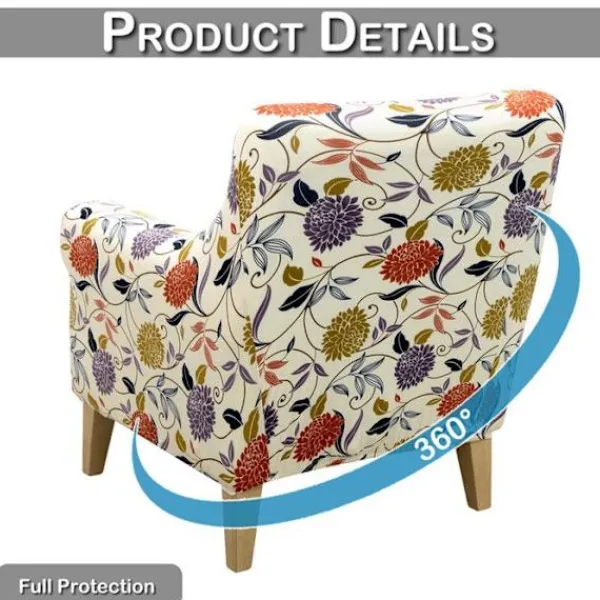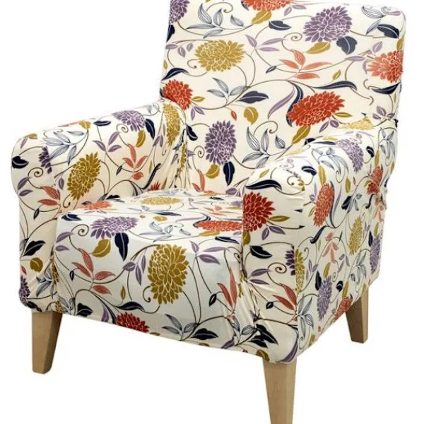 Utsträckbar fåtöljöverdrag – 92% polyester + 8% elastan. Blommönster (Crème). Anpassningsbara dimensioner: passar för stolar med måtten 51-79cm (B) x 61-79cm (D) x 71-89cm (H). Lätt att installera utan fästen. Maskintvättbar (kallt vatten, inget blekmedel, torktumling låg temperatur). Fläcksäkert och slitstarkt. Perfekt för att förnya eller skydda en fåtölj. Obs: mönstren kan variera något.