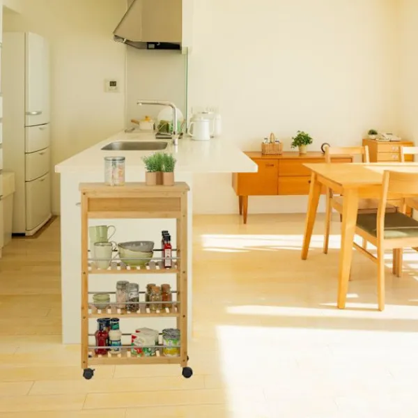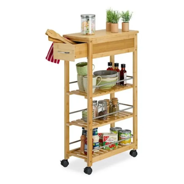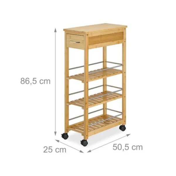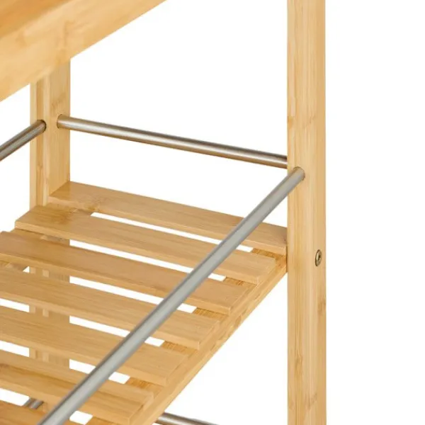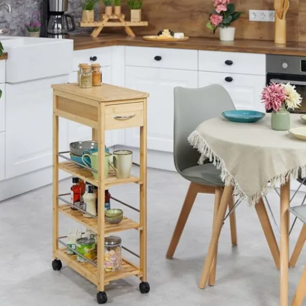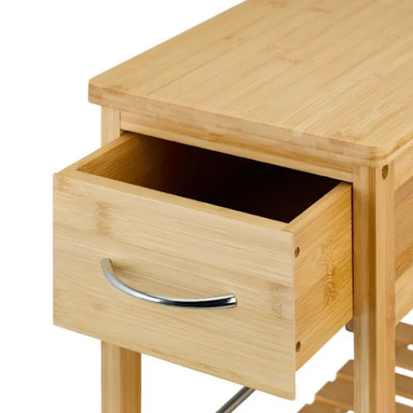 Denna praktiska vagn blir din nya följeslagare i köket. Servisvagnen erbjuder gott om förvaringsutrymme på 3 nivåer för att hålla burkar med matvaror och kryddor alltid inom räckhåll. Lådan rymmer bestick, köksredskap eller handdukar. Tack vare de 4 lättmanövrerade hjulen kan du flytta vagnen med enkelhet. Dessutom kännetecknas den av sin naturliga design i bambu och sina silverfärgade metalldelar.