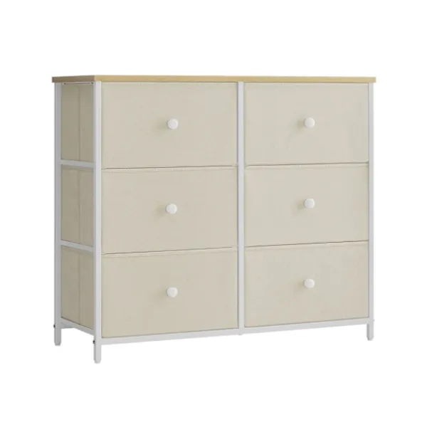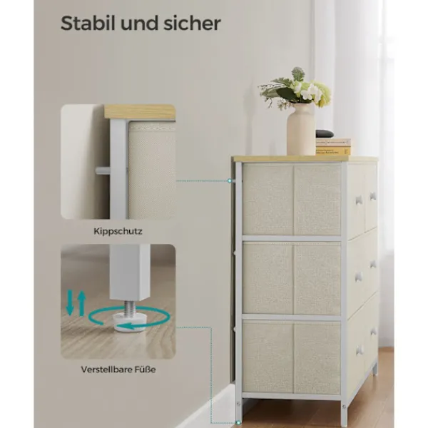 Med sin kamelgul-krämvita färg och lådfronter i tyg ger detta skåp en touch av elegans till alla rum och smälter sömlöst med vilken inredning som helst.