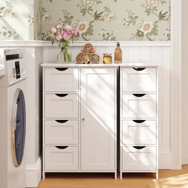 Rotz -sidoskåpet är den perfekta blandningen av funktionalitet och estetik. Med sina fyra rymliga lådor ger det gott om utrymme för alla dina badrumsredskap samtidigt som du lägger en touch av elegans till din dekor. Den smidiga utdragningsdesignen för lådorna säkerställer enkel åtkomst till dina föremål, vilket gör organisationen till en bris. Förbättra ditt bostadsyta med detta eleganta skåp som också fungerar som en vacker kontaktpunkt.