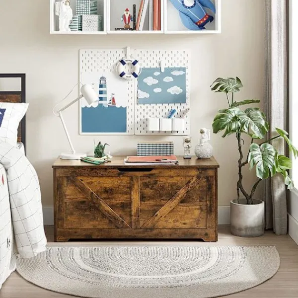 MER FÖRVARINGSUTRYMME : Öppna locket – Den rymliga interiören (100 x 40 x 46 cm) erbjuder gott om plats för kläder och leksaker. Tack vare de två gångjärnen med steglös hållfunktion är det ingen risk att fingrarna kläms